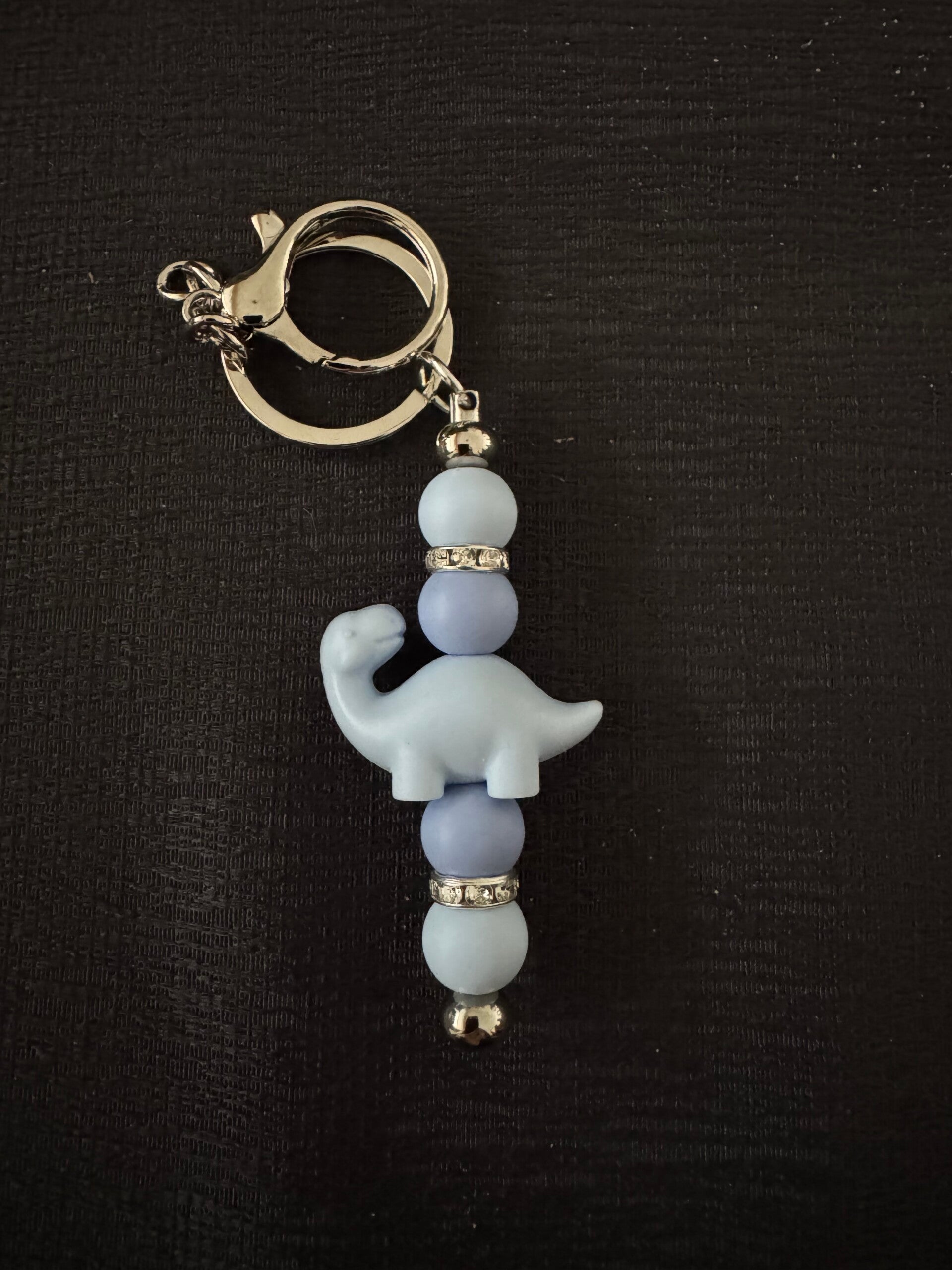Staaf sleutelhanger met in het midden een blauwe lang nek dino