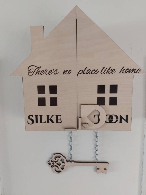 Sleutelkastje als huis gemaakt. Dit een persoonlijke touch gegeven daar de namen van de bewoners erin te graveren.